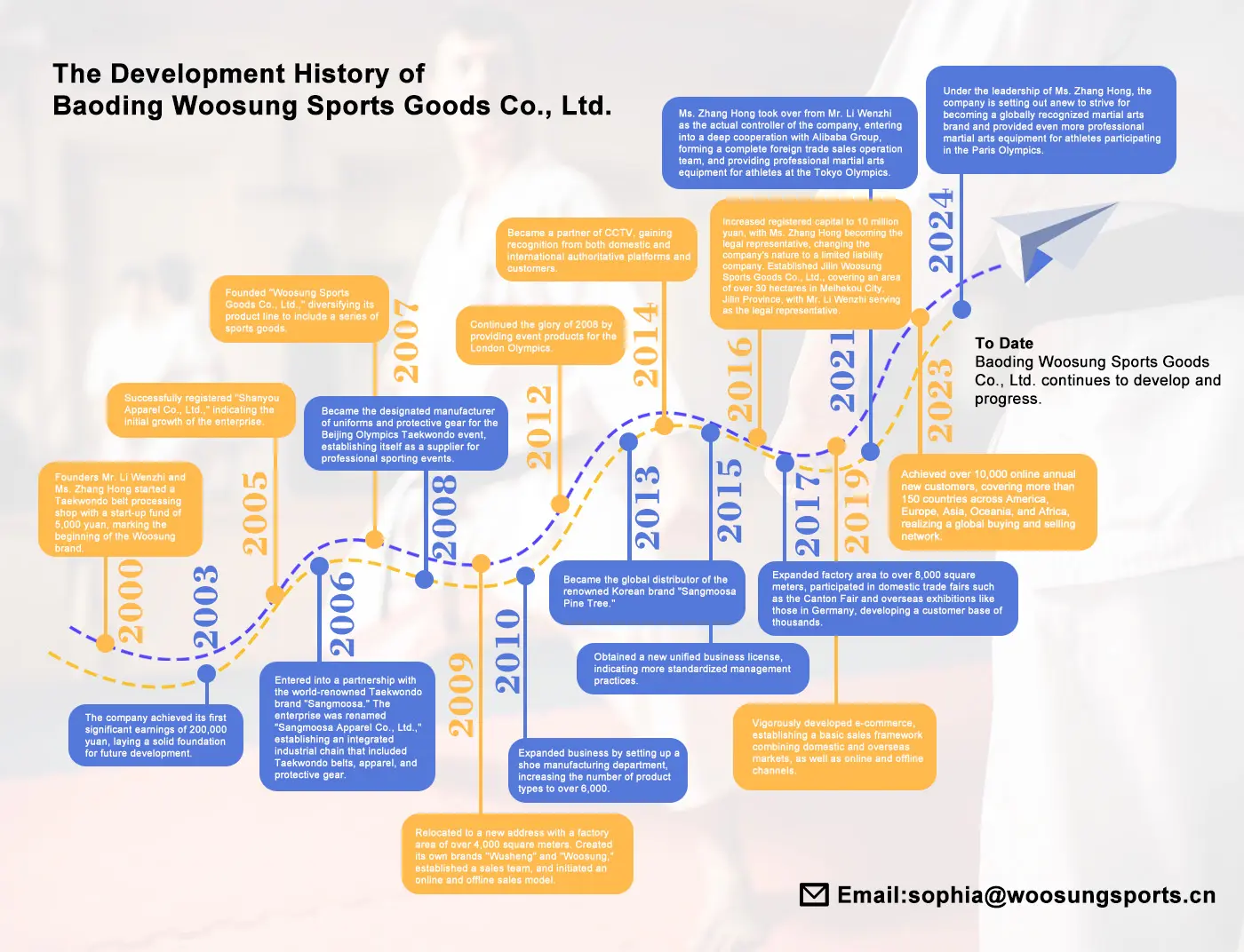 En 2016, Woosung Sports Goods a augmenté son capital enregistré à 10 millions de yuans, Mme Zhang Hong en tant que représentant légal, transitionnant la société vers une entité à responsabilité limitée. En 2017, la société a élargi sa zone d'usine à plus de 8 000 mètres carrés, participant à de nombreux foires nationales et internationales telles que la foire de Canton en Chine et des salons commerciaux en Allemagne, en développant des relations avec plus d'un millier de clients.