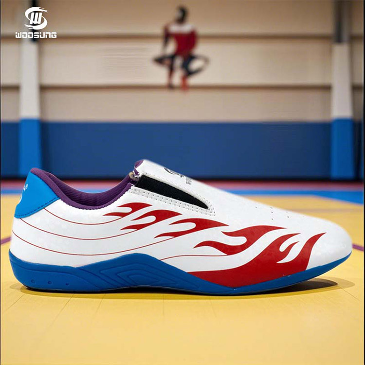 Les chaussures de sport de Taekwondo de Woosung sont spécialement conçues pour répondre aux exigences exigeantes des pratiquants de taekwondo. Dotées d'une tige blanche élégante ornée de graphismes de flammes rouges et bleues vibrantes, ces chaussures sont non seulement impressionnantes, mais offrent également un regain de confiance sur le tapis. La marque Woosung est synonyme de qualité et d'innovation, et ces chaussures ne font pas exception.